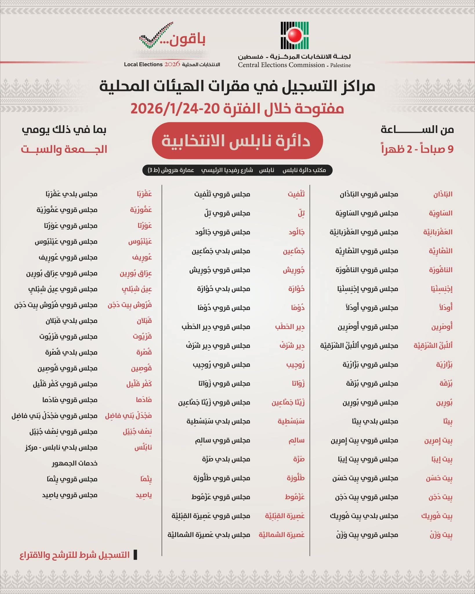 تعلن بلدية عقربا وبالتعاون مع لجنة الانتخابات المركزية للمواطنين الكرام عن فتح مركز تسجيل في مقر بلدية عقربا – الطابق الأرضي، وذلك وفق التفاصيل التالية: فترة التسجيل :